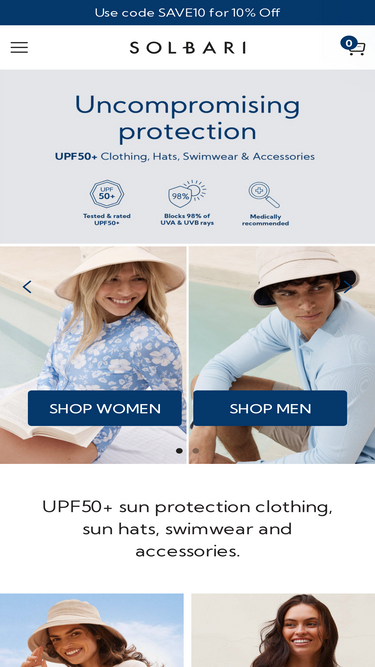 87%Solbari offers UPF50+ sun protective clothing, sun hats and accessories designed to protect your skin from harmful UV exposure.