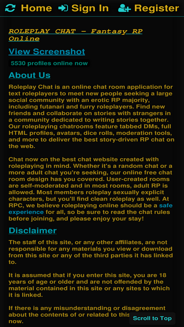 Roleplay Chat is an online chat room application for text roleplayers that boasts a large social community with an erotic RP majority.