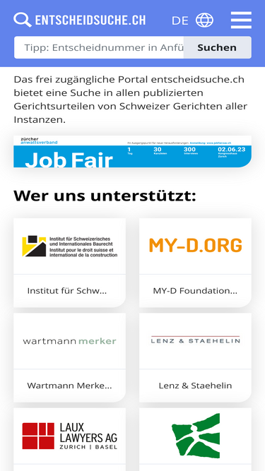 Das frei zugängliche Portal entscheidsuche.ch bietet eine Suche in allen publizierten Gerichtsurteilen von Schweizer Gerichten aller Instanzen. Le portail entscheidsuche.ch, accessible gratuitement, permet d'effectuer des recherches dans tous les arrêts publiés de tribunaux suisses, de toutes les instances.