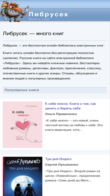 89%На нашем сайте представлено более 500 000 произведений различного жанра для различных возрастных групп и вкусов. Практически во всех книгах, предоставленных на сайте, присутствует возможность скачать или прочитать отрывок для предварительного ознакомления.