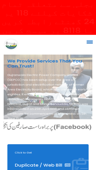 100%gujranwala electric power company (gepco) has been setup over the area of jurisdiction and electrification network of former area electricity board, which was created in early eighties. it encompassed the areas of existing districts of gujranwala, hafizabad, sialkot, narowal, gujrat and mandi bahauddin.