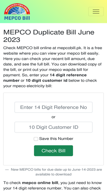 Check mepco latest bill online at mepcobill.pk. This is free website where you can generate mepco duplicate bill and print or download it.