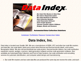 data index is located near seattle, wa. we are a manufacturer of isbn, upc and other bar code film masters and data files, bar code labels, blank and custom direct thermal and thermal transfer labels, and custom flexog raphic labels. we also sell and distribute bar code printers, thermal transfer ribbons, bar code verification equipment, wands, wedges, scanners, label generation software and bar code generation software. also available are automated data collection and point of sale systems, bar code verification and consulting services for automatic identification, and computer aided design and manufacturing.