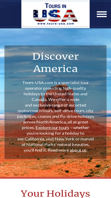 Explore our Tours in USA and Canada. We offer Escorted Motorcoach Tours, Self Drive Tours, Cruises and Vacation Packages in North America. Visit Tours-USA.com.