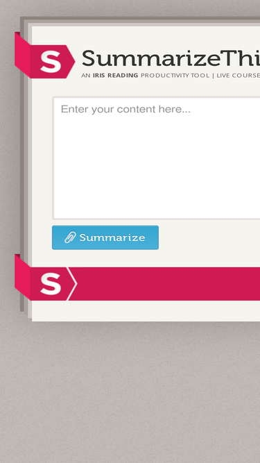 100%summarizethis helps you summarize information you don’t have time to read. it’s like cliffnotes for anything you want to read! enter the text you want to summarize, and our special algorithm will provide you with the most important information you need to read.