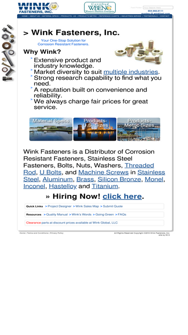 wink fasteners, distributor of fasteners, stainless steel fasteners, bolts, nuts, washers, threaded rod, u bolts, machine screws in aluminum, brass, bronze, monel, inconel, hastelloy and titanium.