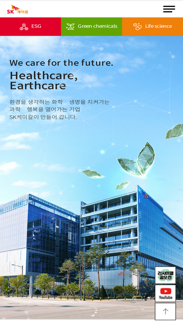 We care for the future Healthcare Earthcare. 환경을 생각하는 화학ㆍ생명을 지켜가는 과학ㆍ행복을 열어가는 기업