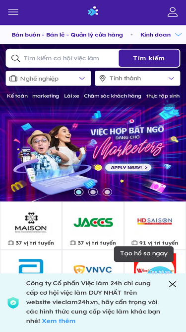 Tìm việc làm nhanh tại Việc Làm 24h cùng 450,000 nhà tuyển dụng hàng đầu Việt Nam. Tạo CV và tải mẫu hồ sơ xin việc tại Vieclam24h để ứng tuyển ngay.
