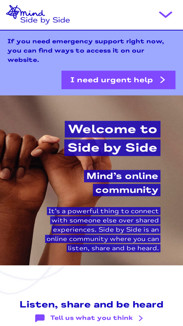 Side by Side is Mind's online peer support community. It is a safe space for people with mental health problems to listen, share, and be heard.