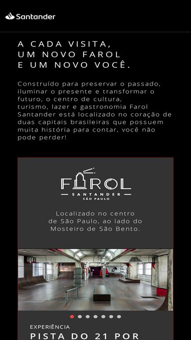 Do alto de São Paulo, o Farol Santander relembra o passado, marca o presente e ilumina o futuro. Visite o Farol Santander e venha fazer parte desta história. Aberto de terça a sábado das 9h às 19h e domingo das 9h às 17h.