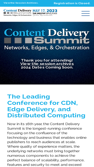 Content Delivery Summit 2023 will take place during Streaming Media East on Wednesday, May 17 in Boston, MA, and will focus on the confluence of the technology and business that enables online publishers to reach audiences at scale.