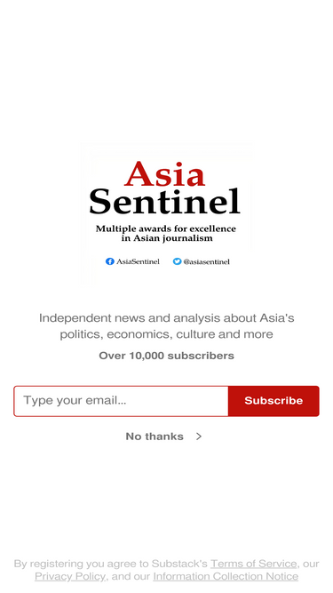 80%Independent news and analysis about Asia's politics, economics, culture and more. Click to read Asia Sentinel, a Substack publication with tens of thousands of subscribers.