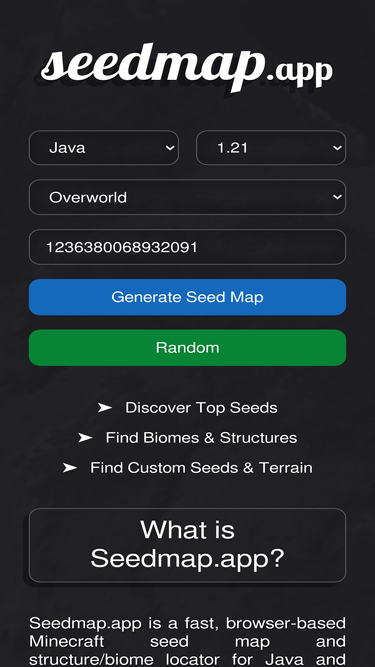 An online Minecraft seed map viewer and seed finder that helps you locate biomes and structures and find best seeds.
