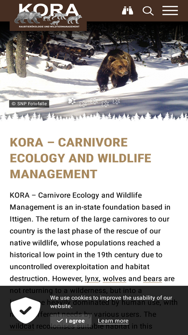 KORA – Carnivore Ecology and Wildlife Management is an in-state foundation based in Ittigen. The return of the large carnivores to our country is the last phase of the rescue of our native wildlife, whose populations reached a historical low point in the 19th century due to uncontrolled overexploitation and habitat destruction. However, lynx, wolves and bears are not returning to a wilderness, but into a landscape heavily dominated by human use, with many different needs by various users. The wildcat recolonises suitable habitat in this landscape, too. The golden jackal is also expanding in Central Europe and was recorded in 2011 for the first time in Switzerland. KORA studies the life history of these five carnivores and monitors the development of their populations. KORA provides information to the authorities and the general public and offers an advisory function. KORA observes the effects of the large carnivores on our cultural landscape and acquires the basis for a conflict free coexistence of large carnivores with humans.