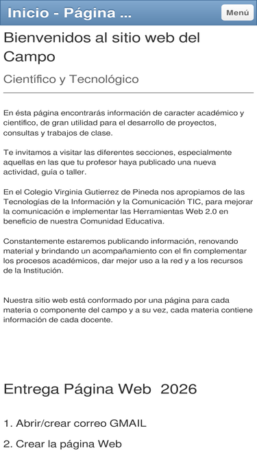 en ésta página encontrarás información de caracter académico y científico, de gran utilidad para el desarrollo de proyectos, consultas y trabajos de clase. te invitamos a visitar las diferentes secciones, especialmente aquellas en las que tu profesor haya publicado una nueva actividad, guía o taller. en el colegio virginia gutierrez de pineda nos apropiamos de las tecnologías de la información y la comunicación tic, para mejorar la comunicación e implementar las herramientas web 2.0 en beneficio de nuestra comunidad educativa. constantemente estaremos publicando información, renovando material y brindando un acompañamiento con el fin complementar los procesos académicos, dar mejor uso a la red y a los recursos de la institución. nuestra sitio web está conformado por una página para cada materia o componente del campo y a su vez, cada materia contiene información de cada docente.