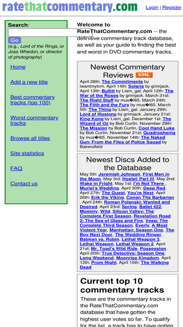 ratethatcommentary.com has reviews and ratings of audio commentary tracks on dvds, blu-rays, and laserdiscs. you can also vote for your favorites (or least favorite) and add reviews to our database.