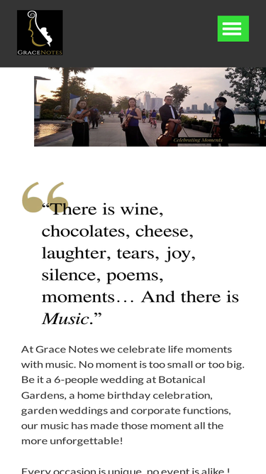 [Need Live Music?] Grace Notes is a Pioneering Group of Musicians based in Singapore. Since 2001, we have performed music of most genres (classical / jazz / contemporary) music at countless events and weddings - adding that special touch of elegance. Now, the group has expanded beyond strings to offer winds and voice.
