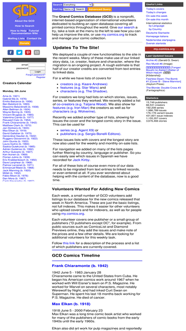 the gcd is building the most comprehensive comics database. it is fully searchable and includes data on creator credits, story details, or other publication details for comic books worldwide.