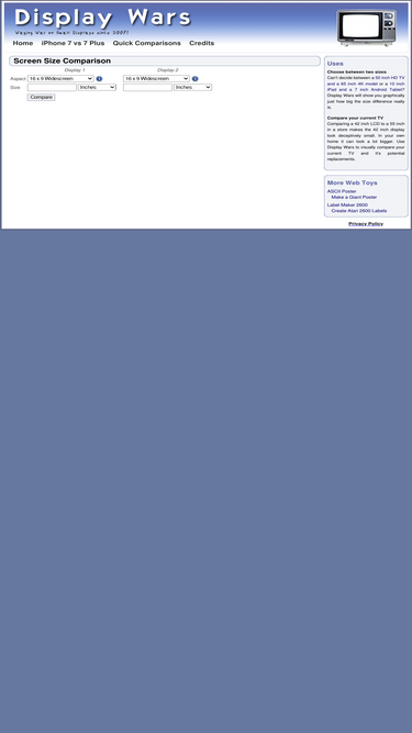 visually compare televisions of different sizes and aspect ratios. easily see the size difference between plasma and lcd displays of various sizes.