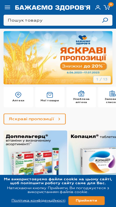 78%Мережа аптек «Бажаємо здоров'я» ⭐️ Каталог ліків, медичних товарів та доглядових засобів ➕ Доступні ціни, акції та знижки ✅ Зручне бронювання ліків онлайн та самовивіз з найближчої аптеки ❤️ Якісний сервіс для кожного клієнта