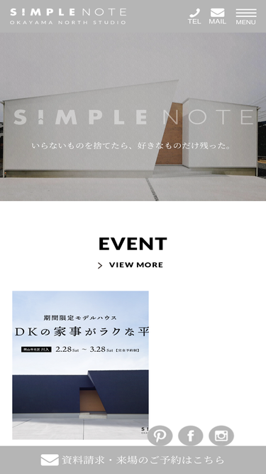 岡山・倉敷で平屋x中庭の新築・注文住宅はシンプルノート岡山北・倉敷スタジオへ。有名建築家が設計した研ぎ澄まされたデザインが特長です。土地探し・ローン相談・アフターメンテナンスまでワンストップで対応致します。