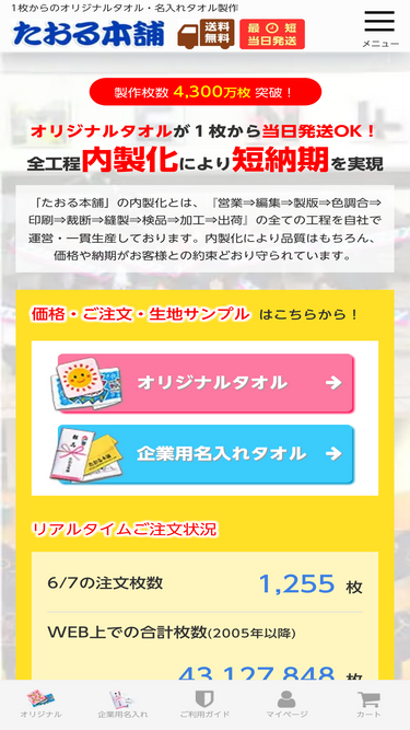 たおる本舗はオリジナルタオルを1枚から製作可能なタオル製作会社です。名入れタオル・マフラータオル・フェイスタオル・スポーツタオルなど、幅広くお取扱いしております。