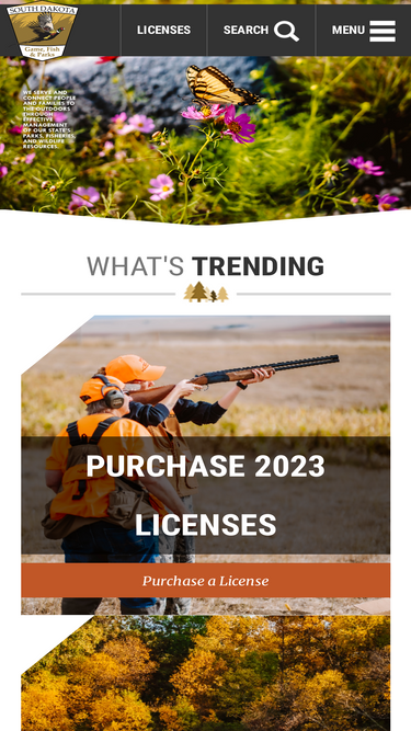 Hunting, Fishing or Camping in South Dakota? The South Dakota Game, Fish and Parks' website has the outdoor related information you need. Buy your license, apply for a big game tag and reserve your campsite on-line.