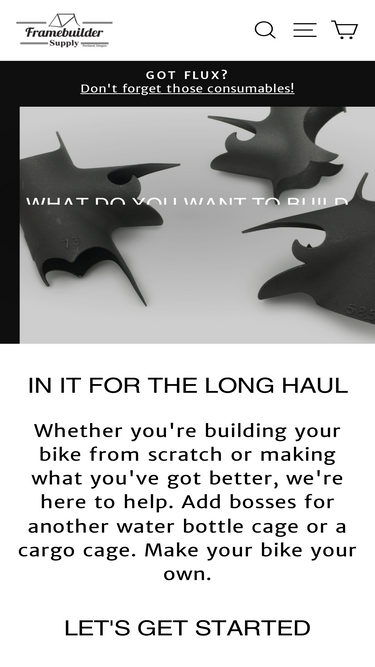 We carry Columbus tubing as well as lugs, dropouts, fork crowns, and braze-ons. We also have proprietary goods and items from Gasflux, Harris, Weld Mold, 3M.
