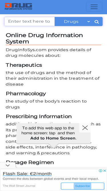 druginfosys provides details of drug molecules about therapeutics, pharmacology, prescribing information and dosage regimen & provides alternates brands for price and packing comparison.