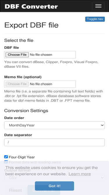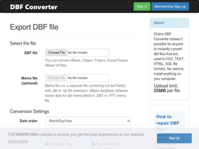 dbf file convert service to csv, text, html and sql script formats. no account or signup required.