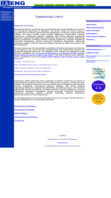 engineering letters is a scholarly peer-reviewed open access academic journal of engineering and computer science. the journal is indexed by scopus, ei compendex, clarivate esci, web of science, journal citation reports with journal impact factor.