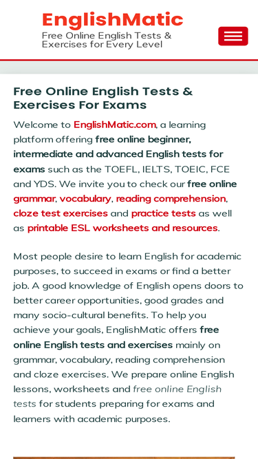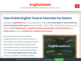 free online english tests & exercises for exams! englishmatic provides beginner, intermediate and advanced level free online english grammar, vocabulary, reading comprehension, cloze test exercises, practice tests, esl worksheets and resources.