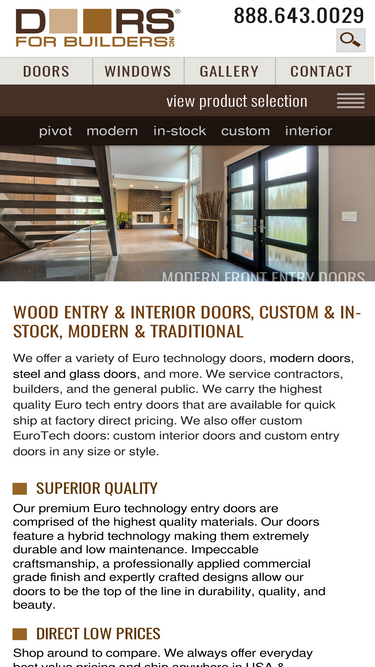 doors for builders is leading supplier of wood entry doors, modern front doors, pivot doors, aluminum patio doors, steel frame glass doors, modern interior doors of superior quality. custom doors designed and crafted in any style and size. stock models available.