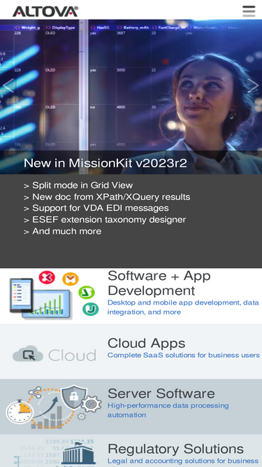 Altova offers a complete line of desktop developer software for XML, JSON, SQL, and UML; high-performance workflow automation server products; and a cross-platform mobile development platform.