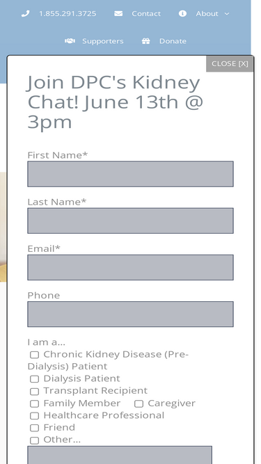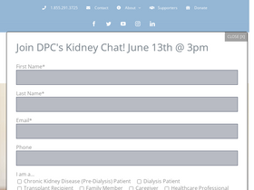 Connecting by phone with other kidney patients and their families The DPC Kidney Chat is a unique program that offers real time support, hope, and education to chronic kidney disease (CKD) patients at all stages of the illness, as well as support for their family and friends. It can be helpful for those adjusting to kidney