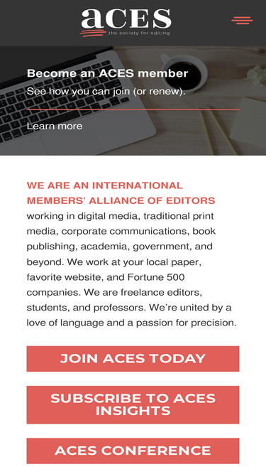 ACES: The Society for Editing is an alliance of editors working to promote language, grammar, and accuracy with an annual conference and valuable resources.
