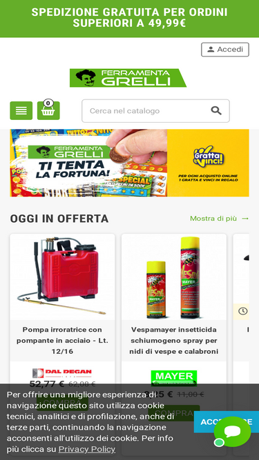 100%Il negozio On-Line di Ferramenta Grelli, nasce per agevolare privati e professionisti che potranno scegliere ed acquistare comodamente da casa ciò di cui hanno bisogno. Grazie alla suddivisione dei prodotti in categorie, sarà facilissimo cercare il prodotto desiderato ed acquistare sul sito con la garanzia di avere lo stesso standard qualitativo e professionale che quotidianamente offriamo alla nostra clientela locale.