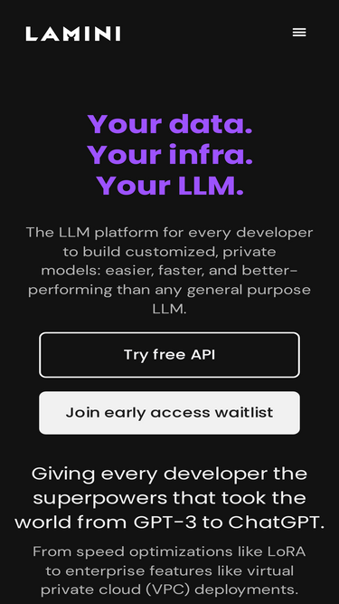 Lamini helps enterprises reduce hallucinations by 95%, enabling them to build smaller, faster LLMs and agents based on their proprietary data. Lamini can be deployed in secure environments —on-premise (even air-gapped) or VPC—so your data remains private.