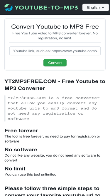 89%YT2MP3FREE.COM is a free converter that allow you easily convert any youtube urls to mp3 format and do not need any registration or software