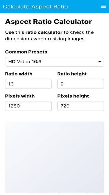 Aspect ratio calculator to get aspect ratio for your images or videos (4:3, 16:9, etc.)