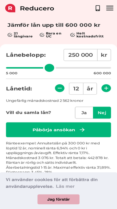 Jämför och Samla lån från fler långivare. Endast en kreditupplysning via UC. Alltid kostnadsfri ansökan. Reducero förmedlar lån med låg ränta.