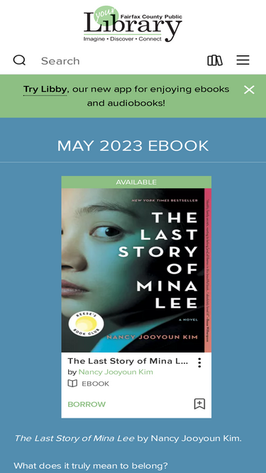 Browse, borrow, and enjoy titles from the Fairfax County Public Library digital collection.