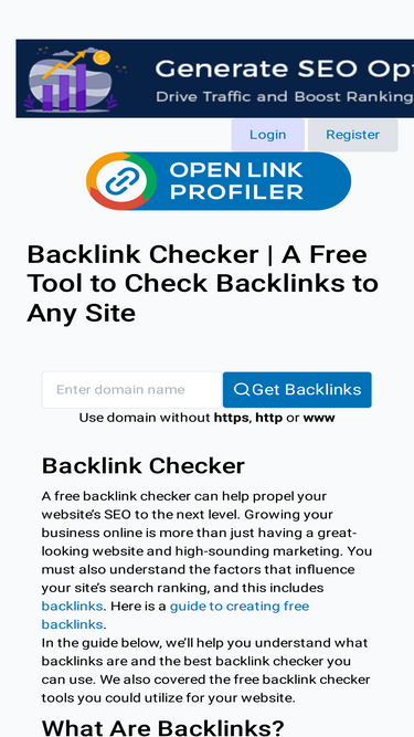 free backlink checker tool and analysis tool. find domain metrics as well as backlinks types, anchor texts and many other critical backlink data.