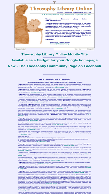 theosophy, pure and simple, in the words of h. p. blavatsky, william q. judge, and others in an organized library of complete and searchable online texts. no organizational affiliations; no memberships or logins required.