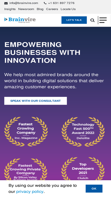 95%Brainvire is an award-winning digital transformation agency headquartered in Texas, USA. We aim at delivering effective digital solutions, including Web and Mobile Application Development, Ecommerce Solutions, CRM, ERP, and many more through our digital consulting services.
