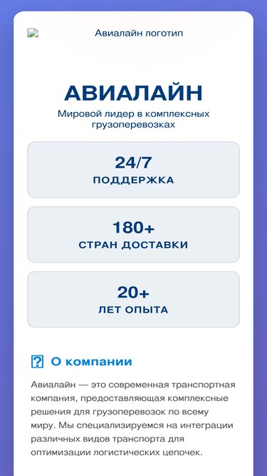 Транспортная компания «Авиалайн» предлагает полный комплекс услуг по доставке грузов. Грузовые перевозки по России и всему миру, авиаперевозки, автоперевозки, морские и железнодорожные перевозки грузов.