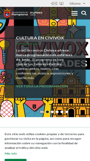 El Ayuntamiento de Pamplona como editor y responsable de este sitio web desea informarle que esta página web emplea cookies analíticas de terceros, concretamente de Google, para la elaboración de perfiles basados en hábitos de navegación del usuario, publicitarias para mostrarle la ubicación de nuestras sedes. Debes saber que compartimos la información sobre el uso que haces de nuestra web con Google, quien puede combinarla con otra información que le hayas proporcionado o que haya recopilado a partir del uso que hayas hecho de sus servicios.