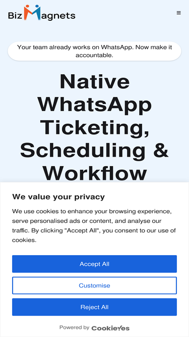 88%Drowning in WhatsApp groups and Excel chaos? BizMagnets gives you clarity, speed, and control — with tickets, tracking, and smart workflows on WhatsApp.