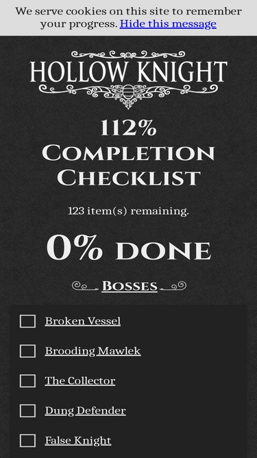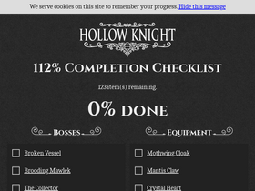 68%A 112% completion checklist for the game Hollow Knight