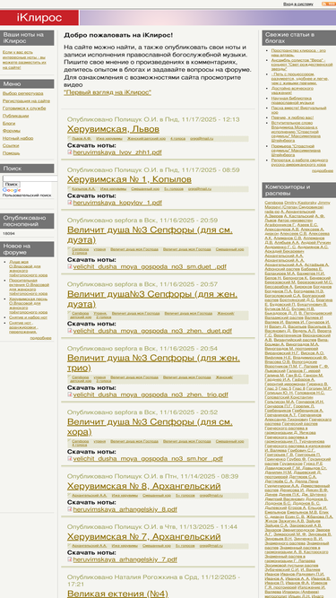 на сайте размещены партитуры церковных песнопений, как повседневных, так и праздничных. предпочтение отдано партесной музыке; трех- и четырехголосию. ноты в удобочитаемом формате pdf.
